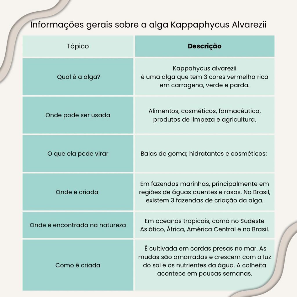 Como se observa, apesar do nome pouco familiar, a Kappaphycus está mais presente no cotidiano do que se imagina. Isso porque dela se extrai a carragena, substância semelhante ao ágar e com alto poder emulsificante, amplamente utilizada pela indústria alimentícia e cosmética. O composto aparece em produtos comuns do dia a dia, como cremes, pastas de dente, leites, iogurtes e outros itens que precisam de maior consistência.