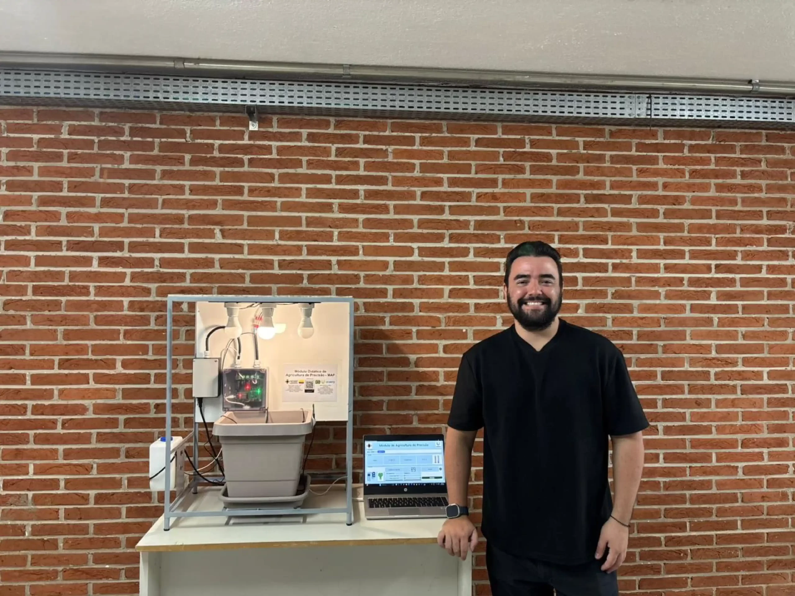 Desenvolvido por Cardona, o Módulo Didático de Agricultura de Precisão (MAP) é um equipamento portátil que oferece o contato com sensoriamento, controle e análise de dados de uma mini estufa. Equipado com sensores que medem temperatura, umidade e raios UV, o protótipo possui um sistema de irrigação por gotejamento, três luminárias de led que simulam o ciclo do sol e um vaso para plantação, controlado por um software em duas modalidades de controle: o automático e o manual.